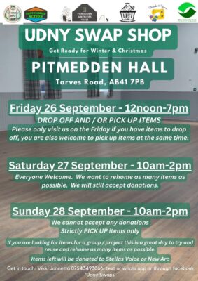 The Udny Swap Shop has a new home for 2025! We have moved to Pitmedden Hall. The Swap Shop runs from 10am-2pm, Saturday and Sunday.